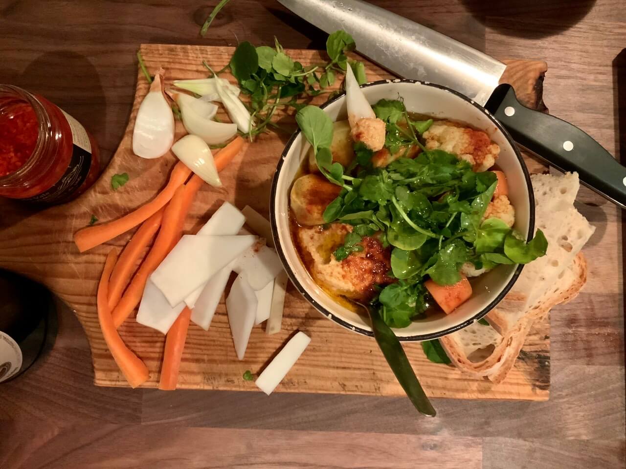 Depois ou vai à colherada ou corta-se uns pedaços ou palitos de vegetais ( cenoura, nabo e cebola… com a cebola é muito bom, mas nem toda a gente gosta) para fazer vez da colher, ou para quem não resiste, o pãozinho ou tostas.. o que é perigoso 😉